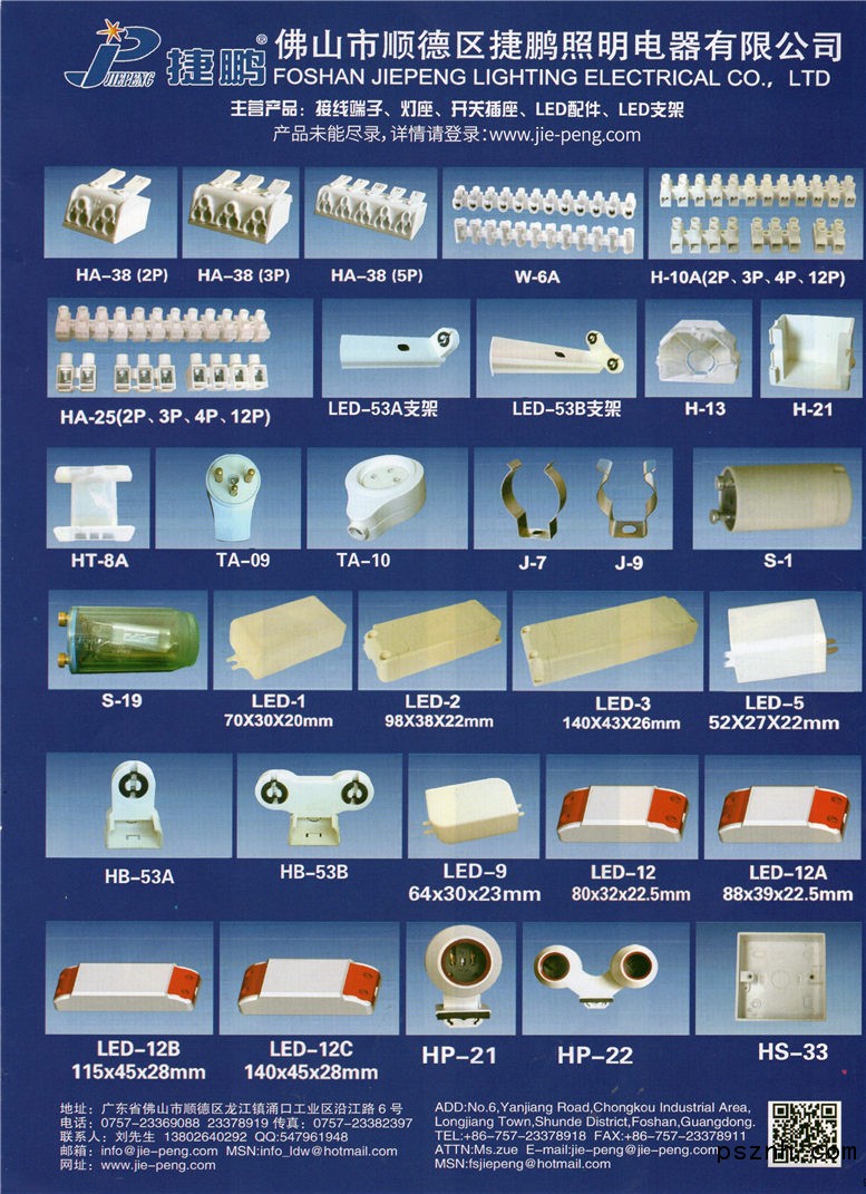 佛山市順德區(qū)捷鵬照明電器有限公司是一家專業(yè)生產(chǎn)接線排、接線端子、G13、G5、2G11、G24、G10Q、E27、E14燈座、啟輝器座、啟輝器、開關(guān)插座、配電箱、LED球泡燈配件、LED塑料天花燈配件、LED塑料筒燈配件、LED驅(qū)動器外殼,電子鎮(zhèn)流器外殼,電子變壓器塑料外殼,電感鎮(zhèn)流器骨架,電感變壓器骨架,尼龍扎帶及其它燈具燈飾五金塑料配件的生產(chǎn)制造商。