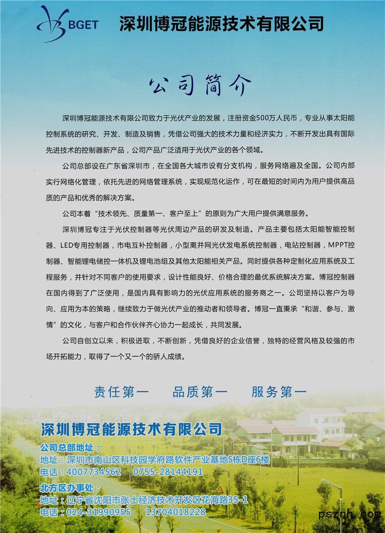 深圳博冠能源技術(shù)有限公司專注于光伏光伏控制器等光伏周邊產(chǎn)品的研發(fā)與制造。產(chǎn)品主要包括太陽能智能控制器、LED專用控制器,市電互補(bǔ)控制器,小型離并網(wǎng)光伏發(fā)電系統(tǒng)控制器,電站控制器,MPPT控制器及其他太陽能相關(guān)產(chǎn)品。同時(shí),提供各種定制化應(yīng)用系統(tǒng)及工程服務(wù)。并針對不同客戶的使用要求設(shè)計(jì)性能良好、價(jià)格合理的最優(yōu)系統(tǒng)解決方案,博冠控制器在國內(nèi)得到了廣泛使用,是國內(nèi)具影響力的光伏應(yīng)用系統(tǒng)的服務(wù)商商之一。公司將堅(jiān)持以客戶導(dǎo)向、應(yīng)用為本的策略,繼續(xù)專注于在光伏產(chǎn)業(yè)的推動(dòng)者和服務(wù)者。博冠將秉承"和諧、參與、激情"的文化,與客戶和合作伙伴齊心協(xié)力一起成長,共同發(fā)展。