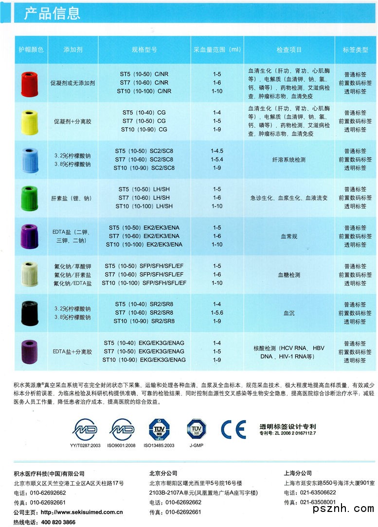 北京積水創(chuàng)格醫(yī)療科技有限公司是由日本積水化學工業(yè)株式會社與國內(nèi)上市企業(yè)中青旅控股股份有限公司于2003年共同組建的合資公司,公司注冊資本1200萬美元,總投資2900萬美元。積水化學工業(yè)株式會社從1985年即開始生產(chǎn)PET真空采血管,是世界上最早生產(chǎn)塑料真空采血管的廠家,具有獨自尖端的生產(chǎn)技術(shù),特別是PET原管制造裝置、血清分離劑填充裝置、藥劑分注裝置等是積水化學經(jīng)過多年研究開發(fā)的高度專業(yè)化的精密儀器。積水創(chuàng)格生產(chǎn)的英派康(INSEPACK)真空采血系統(tǒng),所用制劑和分離膠等的所有原材料均由積水化學工業(yè)株式會社自主開發(fā)研制。強大的技術(shù)實力為英派康(INSEPACK)真空采血產(chǎn)品走向世界、服務(wù)醫(yī)療奠定了堅實的基礎(chǔ)。2010年2月,“北京積水創(chuàng)格醫(yī)療科技有限公司”獨資化,成為積水化學工業(yè)株式會社完全投資的“積水醫(yī)療科技(中國)有限公司”。