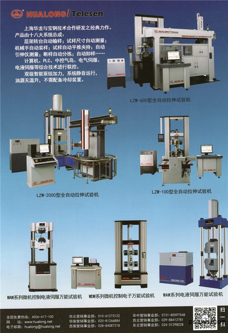 2010年被浦東新區(qū)人民政府命名為“浦東新區(qū)小巨人企業(yè)”。 上海華龍測(cè)試儀器股份有限公司組建于1993年5月8日。集團(tuán)建制為七司五部?jī)赊k三中心,即液壓試驗(yàn)機(jī)分公司、電子試驗(yàn)機(jī)分公司、新特試驗(yàn)機(jī)分公司、機(jī)械制造分公司、南方營(yíng)銷分公司、北方營(yíng)銷分公司、進(jìn)出口貿(mào)易公司、計(jì)劃部、采購(gòu)部、物控部、品質(zhì)部、財(cái)務(wù)部;營(yíng)銷辦公室、綜合辦公室、研發(fā)中心、文控中心、售后服務(wù)中心。在北京、西安、成都、沈陽(yáng)、長(zhǎng)沙、廣州、上海設(shè)置七大區(qū)營(yíng)銷事業(yè)部。華龍研發(fā)生產(chǎn)的沖擊試驗(yàn)機(jī)、拉伸試驗(yàn)機(jī)、蠕變?cè)囼?yàn)機(jī)、壓剪試驗(yàn)機(jī)等測(cè)試產(chǎn)品廣泛應(yīng)用于航空航天、國(guó)防軍工、機(jī)械制造、車輛船舶、鋼鐵冶金、電線電纜、塑料橡膠、建筑建材、大專院校、科研院所、商檢質(zhì)檢等國(guó)民經(jīng)濟(jì)各領(lǐng)域,對(duì)各類金屬、非金屬、構(gòu)件、成品、新材料的各項(xiàng)物理力學(xué)性能測(cè)試、分析和研究。