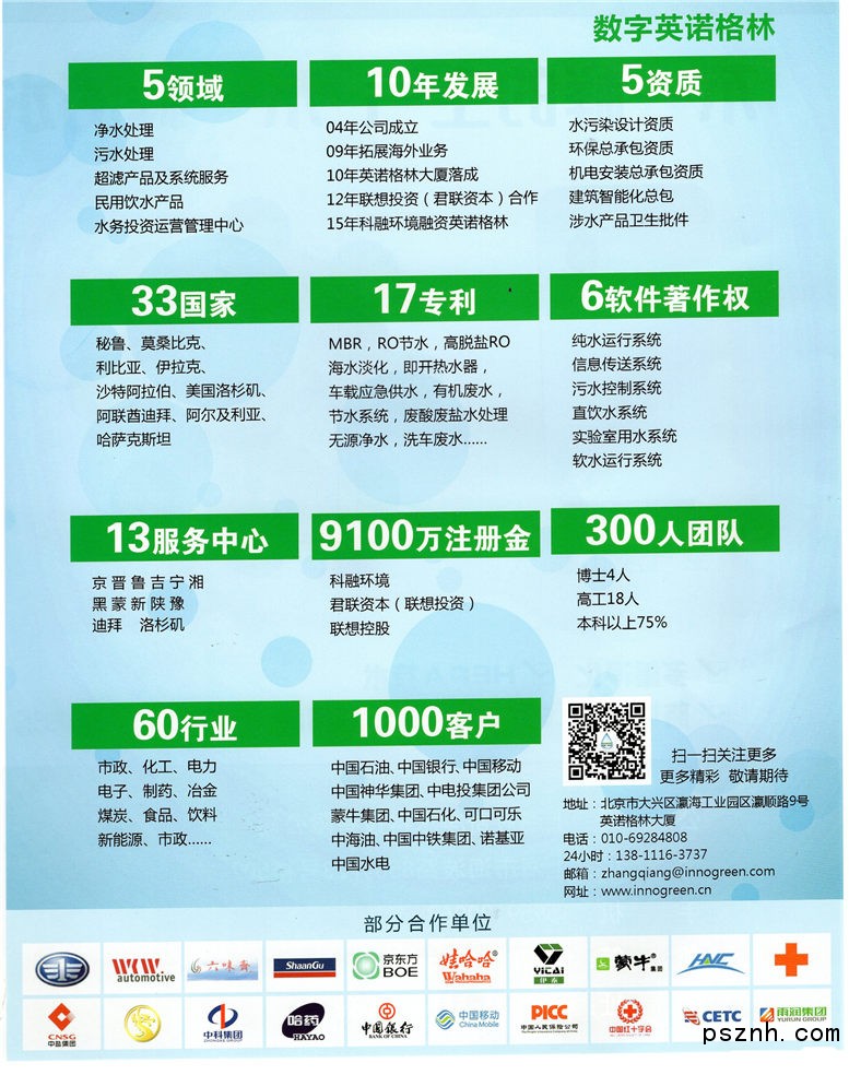 公司注冊資本9100萬元,公司擁有17項水處理相關(guān)國家專利,300余名專業(yè)水處理人才,在北京15000平米現(xiàn)代化廠房和在徐州經(jīng)濟開發(fā)區(qū)占地545畝生產(chǎn)基地,廠房面積67000㎡。英諾格林在市政、化工、電力、電子、制藥、冶金、煤炭、食品飲料、中水回用、垃圾滲濾液、海水淡化等不同領(lǐng)域水處理技術(shù)上均取得了重大突破,并服務(wù)了眾多知名客戶。在膜材料制備、膜組件制造和膜系統(tǒng)應(yīng)用方面,英諾格林整合國內(nèi)一流專家、技術(shù)和設(shè)備,相關(guān)膜產(chǎn)品已經(jīng)達到國內(nèi)領(lǐng)先國際先進的水平。公司獨創(chuàng)的IMWS(innogreen modular watertreatment system英諾格林模塊化水處理系統(tǒng))技術(shù),掀起了水處理領(lǐng)域的革命,通過眾多項目積累的模塊化設(shè)備的經(jīng)驗,確保了每個系統(tǒng)的可靠性、穩(wěn)定性和易用性,引領(lǐng)了未來水處理行業(yè)的發(fā)展。
