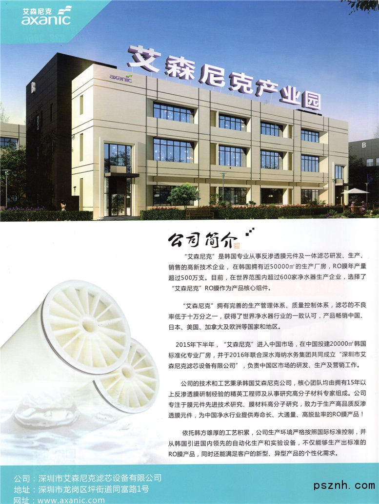 2015年下半年,艾森尼克進(jìn)入中國(guó)市場(chǎng)。并于2016年聯(lián)合深水海納水務(wù)集團(tuán)共同成立"深圳市艾森尼克濾芯設(shè)備有限公司",負(fù)責(zé)中國(guó)區(qū)市場(chǎng)的研發(fā)、生產(chǎn)及營(yíng)銷工作。中國(guó)公司的技術(shù)和工藝秉承韓國(guó)艾森尼克公司,核心團(tuán)隊(duì)均由擁有15年以上反滲透膜研制經(jīng)驗(yàn)的精英工程師及從事研究高分子材料專家組成!依托韓方雄厚的工藝積累,公司生產(chǎn)環(huán)境嚴(yán)格按照國(guó)際標(biāo)準(zhǔn)控制,并從韓國(guó)引進(jìn)國(guó)內(nèi)領(lǐng)先的自動(dòng)化生產(chǎn)和實(shí)驗(yàn)設(shè)備,不僅能夠生產(chǎn)出標(biāo)準(zhǔn)的RO膜產(chǎn)品,同時(shí)還能滿足客戶的新型、異型產(chǎn)品的個(gè)性化需求。