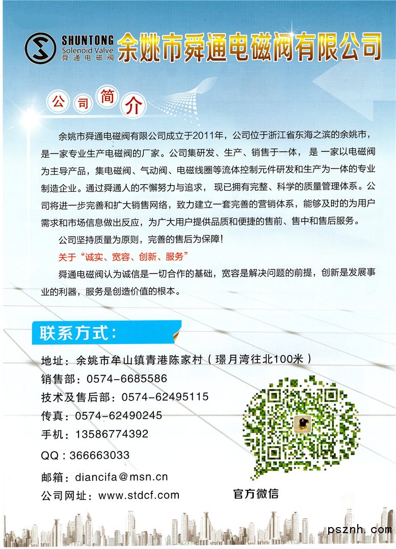 舜通電磁閥認為誠信是一切合作的基礎(chǔ),寬容是解決問題的前提,創(chuàng)新是發(fā)展事業(yè)的利器,服務是創(chuàng)造價值的根本。