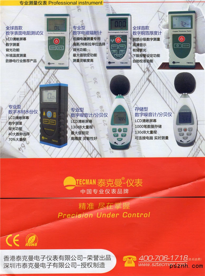 泰克曼電子儀器(香港)控股有限公司深圳市泰克曼電子有限公司公司簡(jiǎn)介: 香港泰克曼電子儀器控股有限公司(TECMAN ELECTRonIC INSTRUMENT HOLDINGS LIMITED)專業(yè)研發(fā)及制造TECMAN(泰克曼)品牌系列各類專業(yè)儀器儀表,公司產(chǎn)品包含:便攜式非接觸紅外測(cè)溫儀、數(shù)字式測(cè)振儀、超聲波測(cè)厚儀、涂層測(cè)厚儀、數(shù)字風(fēng)速風(fēng)量計(jì)、數(shù)字噪音計(jì)、數(shù)字式溫濕度計(jì)、人體測(cè)溫儀等專業(yè)儀表;對(duì)國(guó)內(nèi)外行業(yè)特殊需求客戶提供OEM及ODM相關(guān)服務(wù)。 本公司秉持:品質(zhì)創(chuàng)造價(jià)值;科技 服務(wù)于人的企業(yè)發(fā)展理念,堅(jiān)持不懈的為國(guó)內(nèi)外客戶提供性能穩(wěn)定,品質(zhì)優(yōu)良的產(chǎn)品。 TECMAN品牌在國(guó)內(nèi)外市場(chǎng)的建設(shè)和推廣是本公司堅(jiān)定不移的目標(biāo),為客戶提供品質(zhì)優(yōu)良的產(chǎn)品和快捷無憂的售后服務(wù)是本公司信守的諾言。 本公司熱忱歡迎國(guó)內(nèi)外有實(shí)力的客戶共同開發(fā),協(xié)作發(fā)展,開創(chuàng)TECMAN美好的未來。 香港泰克曼電子儀器控股有限公司 TECMAN ELECTRonIC INSTRUMENT HOLDINGS LIMITED