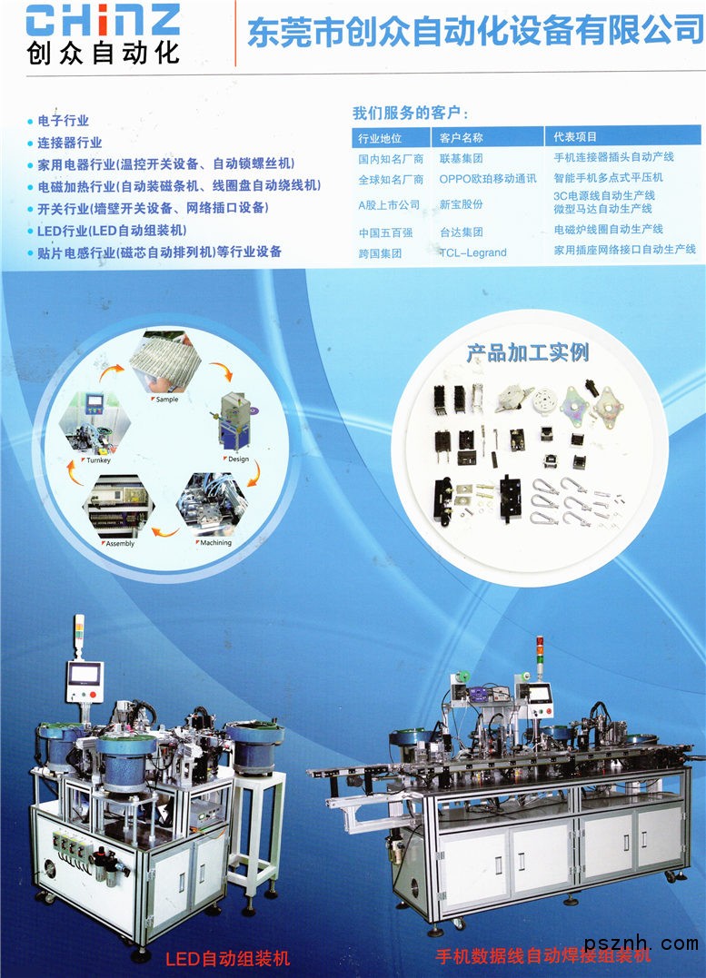 東莞市創(chuàng)眾自動(dòng)化設(shè)備有限公司始創(chuàng)于2007年,具有多年的自動(dòng)化設(shè)備行業(yè)經(jīng)驗(yàn),是行業(yè)領(lǐng)先的專業(yè)非標(biāo)自動(dòng)化設(shè)備制造商之一;創(chuàng)眾致力于為客戶提供全面的自動(dòng)化設(shè)備解決方案;公司坐落于東莞機(jī)械設(shè)備裝備重鎮(zhèn)—石碣,主營(yíng)非標(biāo)自動(dòng)化設(shè)備,服務(wù)項(xiàng)目涉足電子、連接器、五金、醫(yī)療、家電等行業(yè)。 公司自涉足非標(biāo)行業(yè)以來,先后成功為大小知名企業(yè)提供一百余臺(tái)專業(yè)定制非標(biāo)設(shè)備,為法國(guó)在華集團(tuán)公司提供產(chǎn)品開發(fā)與機(jī)器設(shè)計(jì),客戶一致好評(píng)。多年的行業(yè)經(jīng)驗(yàn)、強(qiáng)大的研發(fā)設(shè)計(jì)能力、加工制造能力是我們的核心競(jìng)爭(zhēng)力;我們?yōu)榭蛻籼峁┩晟频氖酆蠓?wù),全面的自動(dòng)化設(shè)備解決方案。 公司主要開發(fā)設(shè)備: 1)基于客戶需求的專業(yè)定制非標(biāo)自動(dòng)化設(shè)備,研發(fā)、生產(chǎn)、制造; 2)貼片電感排料機(jī)、USB自動(dòng)組裝機(jī)、電磁爐自動(dòng)繞線機(jī)、開關(guān)類五金類自動(dòng)組裝機(jī)、電子產(chǎn)品插PIN插端機(jī)、銀點(diǎn)機(jī)、鉚接機(jī)、連接器組裝設(shè)備、測(cè)試檢測(cè)機(jī)器、自動(dòng)化生產(chǎn)線,等 3)客戶特殊要求的其他專業(yè)定制設(shè)備。 以及,工控設(shè)備代理與技術(shù)支持:可編程PLC、觸摸屏、變頻器、伺服系統(tǒng)、馬達(dá)、傳感器、繼電器、氣動(dòng)元件、導(dǎo)軌、開關(guān)電源等。 創(chuàng)眾為您提供滿意的自動(dòng)化設(shè)備,與您攜手共贏!