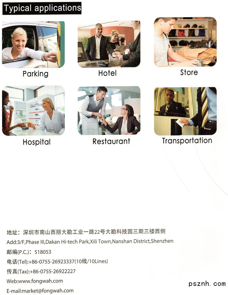 峰華科技產(chǎn)品適用性強, 已廣泛應用于工商稅務、銀行、金融、安全控制、保險(醫(yī)療保險、車輛保險)、三表(水、電、燃氣)、公安、電信、教育、電子商務、電子政務、會議簽到、高速公路、公交、加油站、駕駛員管理、交通運輸、物流、旅游、衛(wèi)生、校園、商場消費、服務業(yè)及一卡通(門禁、考勤、餐飲、停車場)等領域。