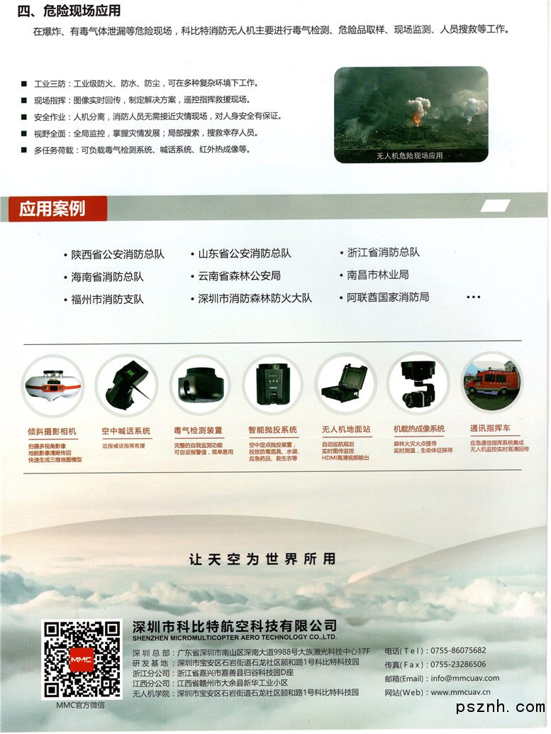 客戶廣泛分布在公安反恐、消防救援、能源巡檢、軍事用途、電力拉線、航空遙感、國(guó)土監(jiān)察、城市規(guī)劃、森林防火、交通管理、空中偵察等多個(gè)行業(yè)。公司培養(yǎng)了一支從事無(wú)人機(jī)服務(wù)的專(zhuān)業(yè)團(tuán)隊(duì),提供巡檢服務(wù)、培訓(xùn)服務(wù)、功能定制開(kāi)發(fā)服務(wù)、系統(tǒng)解決方案開(kāi)發(fā)等。