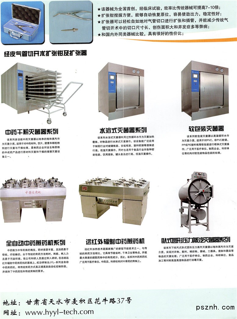 "劍齒象"牌系列消毒滅菌設(shè)備連續(xù)多年榮獲國家《中國知名滅菌器十佳品牌》,2009年"劍齒象",被甘肅省評為著名商標(biāo)。"金銀花"牌遠(yuǎn)紅外輻射中藥煎藥機獲國家科技進(jìn)步二等獎并遠(yuǎn)銷東南亞地區(qū),深受用戶青睞。