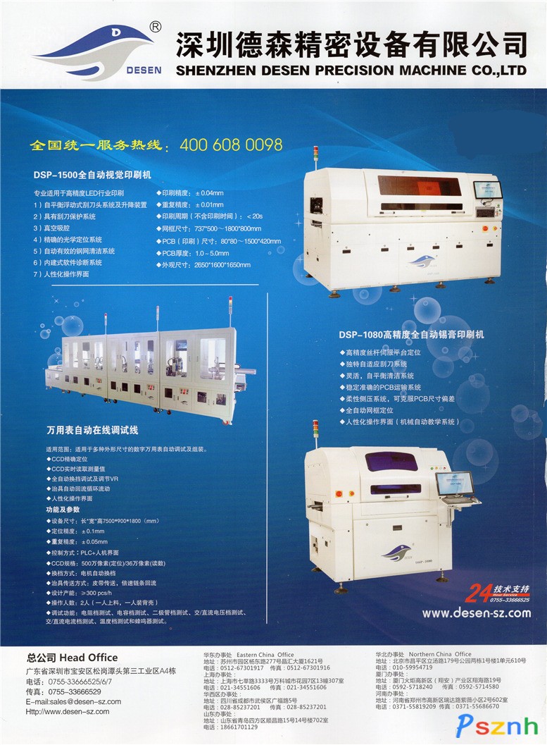 深圳德森精密設(shè)備有限公司于2006年在深圳成立,現(xiàn)有職工二百多人。注冊資本2100萬元,近年來累計投入近2億元資金運營。是一家致力于高精度印刷機設(shè)備研發(fā)、制造、銷售及服務(wù)為一體的國家高新技術(shù)企業(yè)。是國內(nèi)最專業(yè)的SMT全自動視覺錫膏印刷機,TP全自動網(wǎng)印機以及非標(biāo)自動化設(shè)備的供應(yīng)商。公司于2012年獨立運營非標(biāo)自動化事業(yè)部,主要致力于為工廠提供非標(biāo)自動化設(shè)備解決方案。作為“SMT及TP電子裝備行業(yè)的引領(lǐng)者”,德森擁有雄厚的資本實力、強大的研發(fā)技術(shù)、完整的印刷平臺解決方案、優(yōu)秀的品質(zhì)管理及先進(jìn)的生產(chǎn)制造流程以及完善的售后服務(wù)體系。有專注錫膏印刷機9年的技術(shù)沉淀,近年來銷量一直名列前茅。公司銷售網(wǎng)絡(luò)遍布全球,在國內(nèi)開設(shè)多個辦事處,國外多國擁有眾多優(yōu)質(zhì)代理商。德森的產(chǎn)品以其過硬的產(chǎn)品質(zhì)量及優(yōu)質(zhì)服務(wù),贏得了市場與客戶的廣泛贊譽。