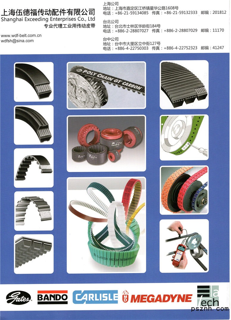 上海伍德福傳動(dòng)配件有限公司系臺(tái)資企業(yè)、臺(tái)灣“伍德福企業(yè)有限公司”之關(guān)系企業(yè)。我司在臺(tái)灣專(zhuān)業(yè)經(jīng)營(yíng)工業(yè)用皮帶,有三十余年歷史;系美國(guó)GATES與CARLISLE(前DAYCO),及日本BANDO等名牌之代理商,并連續(xù)數(shù)年榮獲GATES與BANDO頒發(fā)“亞太地區(qū)”代理商之最佳業(yè)績(jī)表現(xiàn)獎(jiǎng)。