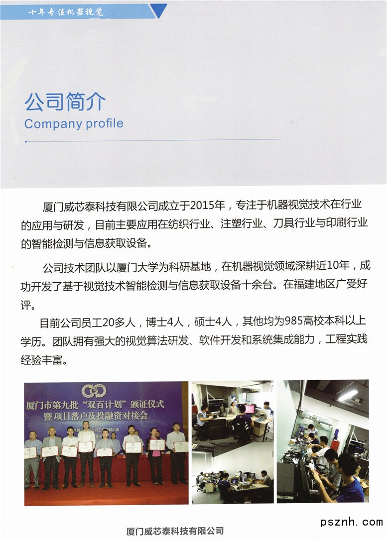 廈門威芯泰科技有限公司成立于2015年,專注于機器視覺技術在行業(yè)的應用與研發(fā)。目前主要研發(fā)紡織行業(yè)、注塑行業(yè)與刀具行業(yè)的智能檢測與信息獲取設備。公司技術團隊以廈門大學為科研基地,在機器視覺領域深耕近10年,成功開發(fā)了基于視覺技術智能檢測與信息獲取設備十余臺套。在福建地區(qū)廣受好評。目前公司員工20人,博士2人,碩士2人,其他均為985高校本科以上學歷。團隊擁有強大的視覺算法研發(fā)、軟件開發(fā)和系統(tǒng)集成能力,工程實踐經驗豐富。