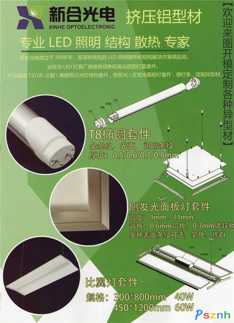深圳新合推出的產(chǎn)品,采用AL-6063-T5鋁擠壓型材,經(jīng)過CNC加工制造,采用陽極氧化、噴砂等表面處理工藝制造而成。主要產(chǎn)品有:LED日光燈、路燈、射燈、平板燈、球泡燈、天花燈、隧道燈、泛光燈、洗墻燈、樓體裝飾燈系列的鋁制散熱外殼。以高品質(zhì)、新穎的結(jié)構(gòu)設(shè)計(jì)和工藝設(shè)計(jì),優(yōu)越的散熱技術(shù)深受用戶好評(píng)。 深圳市新合光電有限公司嚴(yán)格管理、高標(biāo)準(zhǔn)要求,以優(yōu)質(zhì)的產(chǎn)品和服務(wù),成為LED鋁制造行業(yè)的佼佼者 。公司致力于品牌開發(fā),不斷創(chuàng)新和開拓,制造優(yōu)質(zhì)的產(chǎn)品,滿足全球客戶的需求! 企業(yè)宣言:新合品質(zhì)、睿智之選!