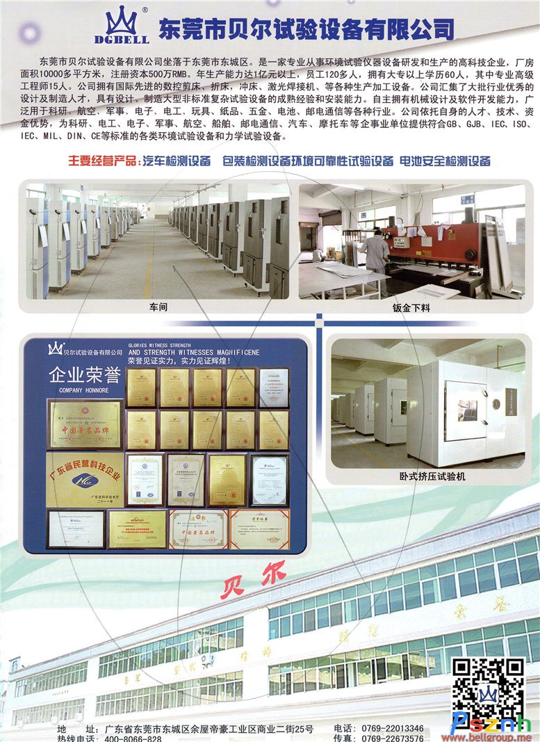 東莞市貝爾試驗(yàn)設(shè)備有限公司 坐落于東莞市東城區(qū)。是一家專業(yè)從事環(huán)境試驗(yàn)儀器設(shè)備研發(fā)和生產(chǎn)的高科技企業(yè),廠房面積10000多平方米,注冊資本500萬RMB。年生產(chǎn)能力達(dá)1億元以上,員工120多人,擁有大專以上學(xué)歷60人,其中專業(yè)高級(jí)工程師15人。公司擁有國際先進(jìn)的數(shù)控剪床、折床,沖床、激光焊接機(jī)、等各種生產(chǎn)加工設(shè)備。公司匯集了大批行業(yè)優(yōu)秀的設(shè)計(jì)及制造人才,具有設(shè)計(jì)、制造大型非標(biāo)準(zhǔn)復(fù)雜試驗(yàn)設(shè)備的成熟經(jīng)驗(yàn)和安裝能力。自主擁有機(jī)械設(shè)計(jì)及軟件開發(fā)能力,廣泛用于科研﹑航空﹑軍事﹑電子﹑電工﹑玩具、紙品、五金、電池、郵電通信等各種行業(yè)。公司依托自身的人才、技術(shù)、資金優(yōu)勢,為科研、電工、電子、軍事、航空、船舶、郵電通信、汽車、摩托車等企事業(yè)單位提供符合GB、GJB、IEC、ISO、IEC、MIL、DIN、CE等標(biāo)準(zhǔn)的各類環(huán)境試驗(yàn)設(shè)備和力學(xué)試驗(yàn)設(shè)備。