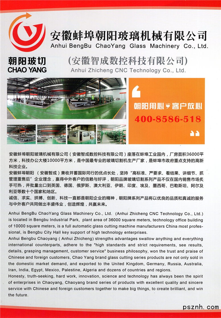 安徽智成數(shù)控科技有限公司(原蚌埠朝陽玻璃機械有限公司)座落在蚌埠工業(yè)園內(nèi),位于果園路與雙墩路交叉口,東連朝陽大橋,南鄰307省道,西接206國道,大慶淮河橋。交通便捷,地理條件優(yōu)越,環(huán)境優(yōu)美,國家“十一五”期間,公司已完成第一期規(guī)劃建設。占地面積約30000平方米,廠房面積18000平方米,科技辦公大樓10000平方米,現(xiàn)有員工480人,是中國最大的全自動玻璃切割機生產(chǎn)廠家,是蚌埠市政府重點支持的高新科技企業(yè)。