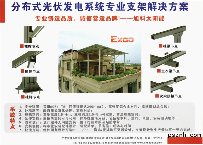 佛山旭科太陽能科技有限公司,隸屬于香港旭科太陽能科技有限公司,位于中國廣東佛山,是一家服務(wù)全球的專業(yè)光伏支架生產(chǎn)企業(yè)。旭科太陽能秉承卓越和創(chuàng)新的理念,致力于為全球太陽能光伏電站提供經(jīng)濟(jì)安全的光伏支架解決方案及相關(guān)產(chǎn)品與服務(wù),業(yè)務(wù)范疇包括光伏電站結(jié)構(gòu)和基礎(chǔ)設(shè)計(jì),研發(fā),產(chǎn)品供應(yīng),工程管理及安裝服務(wù)。目前已為全球20多個(gè)國家和地區(qū)的太陽能電站提供超過600MW的專業(yè)支架產(chǎn)品和設(shè)計(jì)服務(wù),并與國內(nèi)外諸多知名光伏企業(yè)建立長期合作的戰(zhàn)略合作伙伴關(guān)系,旭科太陽能已成為光伏電站建設(shè)的信心品牌。