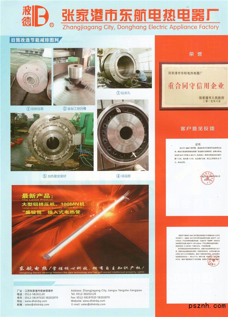 張家港市東航電熱電器廠成立于1971年,是研制各種金屬管狀電熱元件產(chǎn)品的制造商。“波德”牌商標(biāo)于93年注冊(cè),專為工業(yè)用電加熱管,產(chǎn)品質(zhì)量符合JB/T2379-93部頒標(biāo)準(zhǔn)(本廠是93標(biāo)準(zhǔn)起草單位之一)?,F(xiàn)在,“波德”牌產(chǎn)品被中國(guó)鋁加工工業(yè)廣泛采用,從630T-10000T以上大中型國(guó)內(nèi)外銅、鋁型材擠壓機(jī),盛錠筒(擠壓筒)配套加熱用。如:美國(guó)薩頓、日本宇部、意大利達(dá)涅利、德國(guó)西馬克、薩帕鋁(江陰)公司、臺(tái)灣建華、源上、梅瑞、新泳、誼昌、聲傑 等。國(guó)內(nèi)如:太原重型機(jī)械、西安重型所、沈陽(yáng)新鑫模具、中冶陜壓、廣東佛山明晟機(jī)械、佛山業(yè)精機(jī)械、佛山南海金瀝機(jī)械、佛山興橋重型、佛山新頌星、無(wú)錫源昌、無(wú)錫市威特機(jī)械等,有五家公司近四年來(lái)新開發(fā)的短行程擠壓機(jī)配用“波德”牌直插式節(jié)能電熱管已隨機(jī)銷往世界各地。