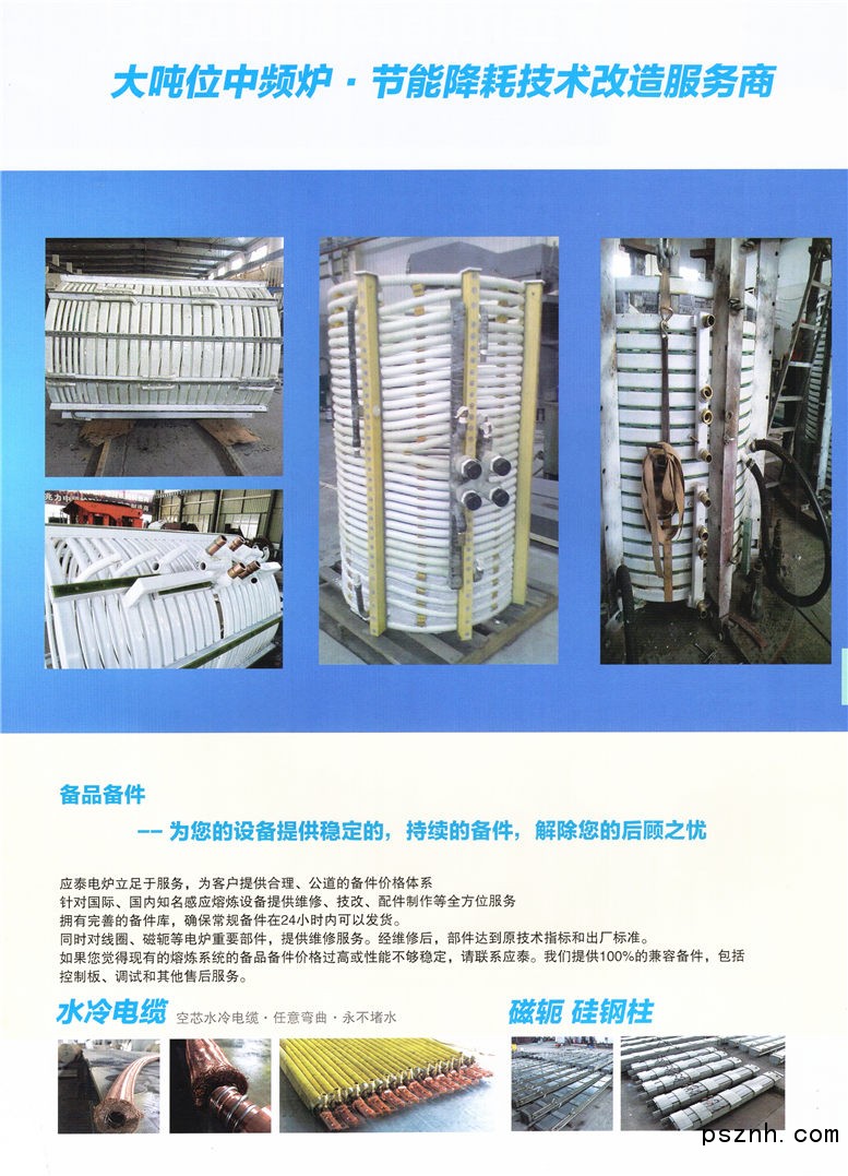 新型節(jié)能烤瓷感應(yīng)圈、節(jié)能干式電抗器、油浸式電抗器、新型空心水冷電纜、磁軛(硅鋼柱)、自動(dòng)液壓換爐開關(guān)、水冷爐蓋、鋁合金爐殼、不銹鋼消磁材料;高強(qiáng)絕緣柱、金云母板、四氟板、電纜無碳橡膠管、KK\KP、電力電容器;中頻爐耐火磚、耐高溫澆注制式塊、高分子石棉板、石棉夾磚、無塵石棉布;