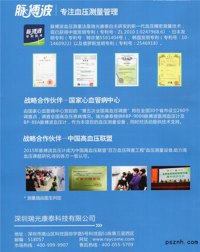 在國內(nèi),脈搏波血壓測量法已經(jīng)在北京阜外醫(yī)院、華中科技大學同濟醫(yī)學院附屬協(xié)和醫(yī)院等二十 余家大型三甲醫(yī)院通過臨床驗證。集團開發(fā)的“天天血壓”健康管理客戶端融合先進互聯(lián)網(wǎng)技術(shù),依 托脈搏波血壓計的準確數(shù)據(jù),為顧客提供專業(yè)、長期的血壓健康管理服務(wù)。同時脈搏血壓計產(chǎn)品已拿 到注冊證8個型號將近20個。規(guī)格涵蓋院用、OTC、移動使用、兒童專用。
