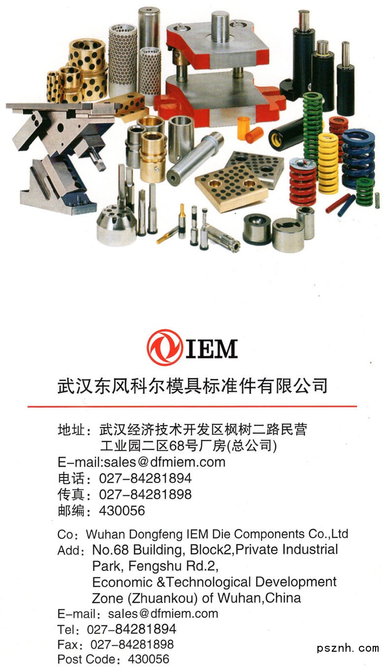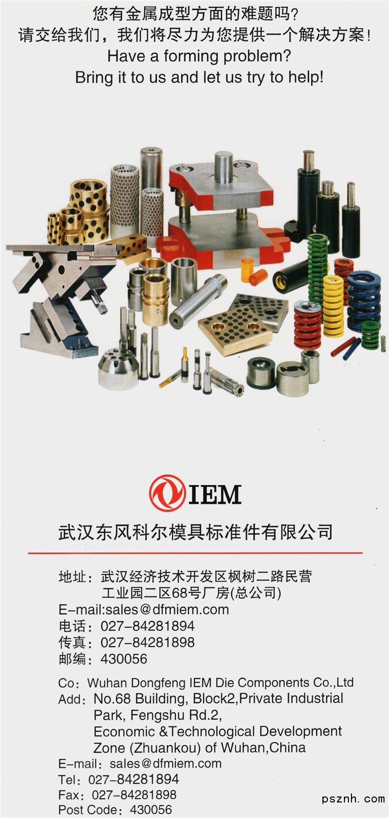 公司注冊于中國湖北省武漢經(jīng)濟(jì)技術(shù)開發(fā)區(qū)高科技產(chǎn)業(yè)園,分設(shè)武漢、十堰兩個(gè)生產(chǎn)工廠,在美國、德國、意大利、日本、韓國、印度分別建立了分銷渠道,在中國設(shè)有上海、廣州、天津、重慶等銷售辦事處。產(chǎn)品包括斜楔、折邊機(jī)構(gòu)、沖頭、凹模、固定板、導(dǎo)柱、導(dǎo)套、導(dǎo)板等全系列沖壓模具標(biāo)準(zhǔn)件產(chǎn)品,東風(fēng)IEM標(biāo)準(zhǔn)涵蓋了NAAMS、VDI、JIS等行業(yè)標(biāo)準(zhǔn),以及全球主要汽車公司的專有標(biāo)準(zhǔn)。公司以豐富的產(chǎn)品線,以及覆蓋全球的銷售網(wǎng)絡(luò),為客戶提供方便快捷的服務(wù)。