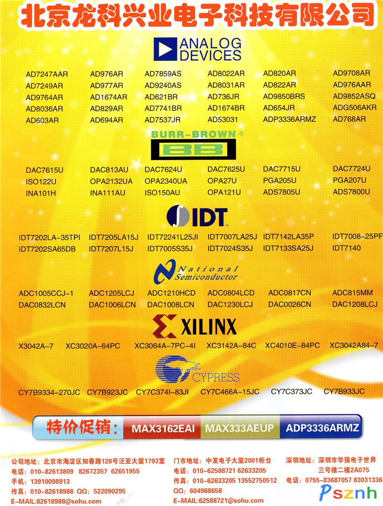 主營范圍:• 可編程邏輯類,包含 CPLD, FPGA及相關(guān)配置芯片,產(chǎn)品線有Xilinx; Altera; Lattice; Actel。 • 處理器類,包括 MCU, PowerPC, VoPP, DSP等,產(chǎn)品線有TI; Aodiocodes; Free Scale; Atmel。 • 存儲器類,包括 SRAM, DRAM和 FLASH等,產(chǎn)品線有 Cypress; Hynix; SST; Spansion。 • 通信及網(wǎng)絡(luò)應(yīng)用類,產(chǎn)品線有 Zarlink; PMC-sierra; Mindspeed; Legerity; Infineon。 • 微波射頻與頻率控制類,產(chǎn)品線有 M/A-com; Free Scale; Peregrine; MINI; WJ; Anadigics; Hittite; • 線性器件與電源管理類,產(chǎn)品線有IR;TI; FSC; ST; Linear; PI; Powerdsine。 . • 分立與被動元件類,包括鉭電容和保護器件,產(chǎn)品線有Littelfuse; Kemet; Raychem; Bourns。 • 機電類元件類,包括繼電器,產(chǎn)品線有 TYCO/OEG.