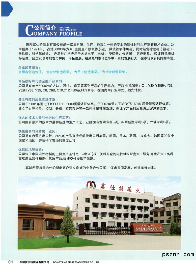 東陽富仕特磁業(yè)有限公司是一家中外合資本企業(yè)。成立于1990年,現(xiàn)有員工300名;企業(yè)已于2001年通過國際質(zhì)量管理標(biāo)準(zhǔn)ISO9001:2000認(rèn)證,2007年3月底前通過了專用于汽車方面的質(zhì)量管理標(biāo)準(zhǔn)ISO/TS16949認(rèn)證,連續(xù)多年被評(píng)為東陽市朝陽企業(yè);連續(xù)多年成為東陽市超百萬納稅大戶。產(chǎn)品大部分出口,資信等級(jí)AAA級(jí)。 本公司主要生產(chǎn)出口磁鐵及磁性應(yīng)用品,工廠擁有國內(nèi)先進(jìn)設(shè)備、雄厚的技術(shù)力量、高精度的檢測(cè)儀器,生產(chǎn)的高性能永磁鐵氧體被廣泛應(yīng)用于家用電器、電機(jī)、汽車電子、自動(dòng)化儀表等領(lǐng)域。年生產(chǎn)能力達(dá)3000噸,90%產(chǎn)品出口10多個(gè)國家和地區(qū),并與歐美及日、韓等多家大公司建立了長期穩(wěn)定的業(yè)務(wù)關(guān)系,公司產(chǎn)品已進(jìn)入NOKIA、西門子、松下、羅杰斯和法拉利等全球著名公司。 現(xiàn)為浙江省高新技術(shù)企業(yè),磁性材料省級(jí)高新技術(shù)特色基地成員,浙江省磁性材料產(chǎn)業(yè)協(xié)會(huì)高新技術(shù)研發(fā)基地。