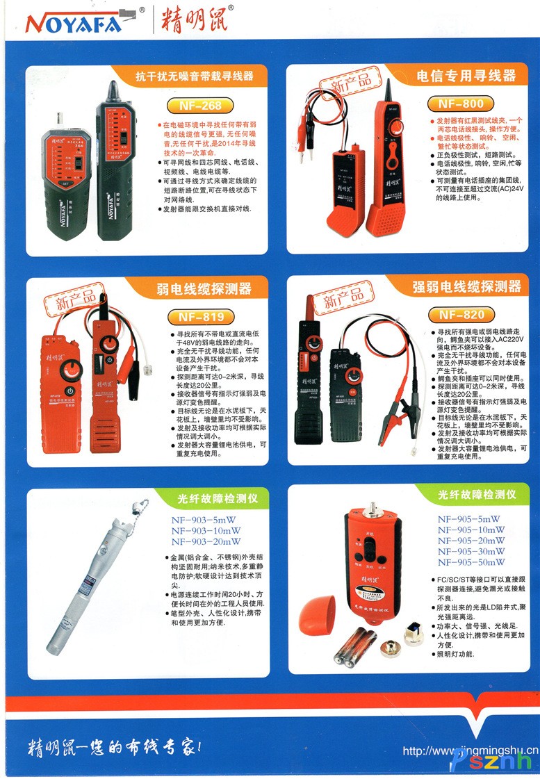 目前公司的主要產(chǎn)品有光儀器儀表產(chǎn)品(如光功率計(jì)、光源、光纖快速接頭等),查線器產(chǎn)品(如近距離探測器精明鼠,管道及墻壁線路探測器等),網(wǎng)絡(luò)線纜長度測試儀(另附有尋線功能,PING測試功能等),查話機(jī),感應(yīng)式測電筆,電信專用套裝工具等產(chǎn)品。