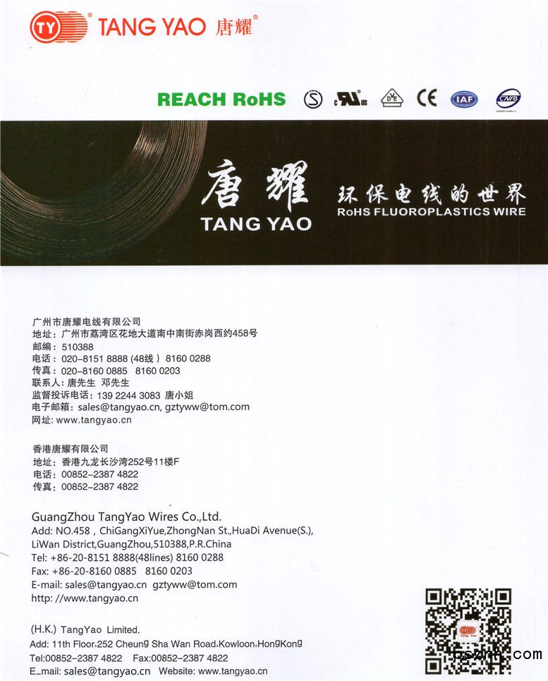 廣州市唐耀電線有限公司是環(huán)保認證高溫電線、環(huán)保高溫電線、高溫電線、鐵氟龍電線、低煙無鹵電線、鐵氟龍?zhí)坠堋⒐枘z電線等產(chǎn)品專業(yè)生產(chǎn)加工的有限責任公司(自然人投資或控股),公司總部設(shè)在廣州市 荔灣區(qū) 花地大道南 中南街 赤4,廣州市唐耀電線有限公司擁有完整、科學的質(zhì)量管理體系。廣州市唐耀電線有限公司的誠信、實力和產(chǎn)品質(zhì)量獲得業(yè)界的認可。歡迎各界朋友蒞臨廣州市唐耀電線有限公司參觀、指導和業(yè)務(wù)洽談。