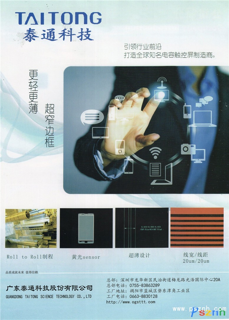廣東泰通科技股份有限公司是專業(yè)從事電容觸摸屏(Touch Panel/Window)研發(fā)、制造、銷售于一體的高科技企業(yè)。公司于2012年10月8日成立,位于廣東省揭陽市經(jīng)濟技術開發(fā)區(qū),注冊資本6000萬元,總投資額3億元,占地面積150畝;主營產(chǎn)品為膜(Film)結構投射式電容觸控屏(CTP)及模組,年產(chǎn)能3600萬片。產(chǎn)品廣泛應用于手機(Mobile)、衛(wèi)星導航系統(tǒng)(GPS)、汽車電子、數(shù)位相機等中小尺寸可攜式電子產(chǎn)品用ITO觸控面板(Touch Panel/Window),以及筆記本電腦(Note Book)、工業(yè)控制產(chǎn)品、家用電器等大尺寸電子產(chǎn)品觸控面板領域。 公司擁有標準的百級無塵生產(chǎn)車間(符合Fed-std-209E潔凈室標準),并從臺灣、日本和法國等地引進國際先進的現(xiàn)代化的全自動生產(chǎn)設備,立足高起點,采用了代表觸摸屏行業(yè)未來發(fā)展趨勢的卷對卷(Roll to Roll)的黃光制程工藝,可實現(xiàn)超窄邊框、更高精度和更高良率的產(chǎn)品生產(chǎn),為廣大客戶提供更好的服務。