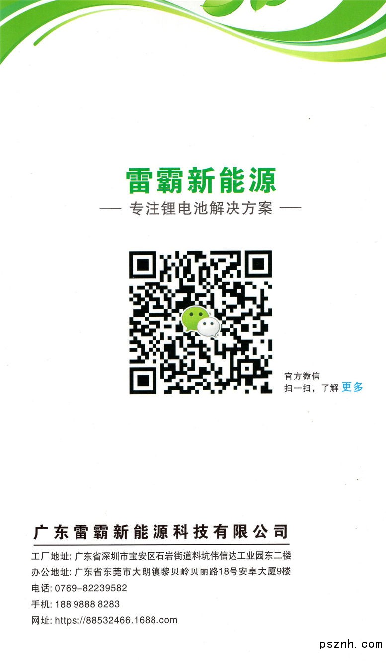 廣東雷覇新能源科技有限公司,本公司成立于2016年,注冊(cè)資本1100萬,主要研發(fā)、生產(chǎn)、銷售各類鋰電池及鋰電池組。作為一家迅速發(fā)展的高科技公司,我們秉持精誠合作的企業(yè)精神,倡導(dǎo)簡單和諧的人際關(guān)系;在研發(fā)上,我們始終堅(jiān)持嚴(yán)謹(jǐn)、創(chuàng)新的科學(xué)態(tài)度;生產(chǎn)中,在使用現(xiàn)代化設(shè)備的同時(shí),通過準(zhǔn)軍事化的管理,生產(chǎn)出質(zhì)量合格的產(chǎn)品;在經(jīng)營上,我們以服務(wù)共贏作為企業(yè)的經(jīng)營理念;在售前,我們認(rèn)真細(xì)致聽取客戶需求,為客戶選擇合適的產(chǎn)品, 提供適合的解決方案;在售后,我們耐心解答客戶問題,及時(shí)、準(zhǔn)確接收客戶的反饋信息,改進(jìn)我們的產(chǎn)品和服務(wù),讓我們的客戶在激烈的市場競爭中處于有利位置,并搶占商機(jī)。愿與廣大朋友攜手共創(chuàng)美好的明天!合作共贏!精誠鑄就品牌,悉心創(chuàng)造輝煌!聯(lián)系電話:18898888283  0769-82839582