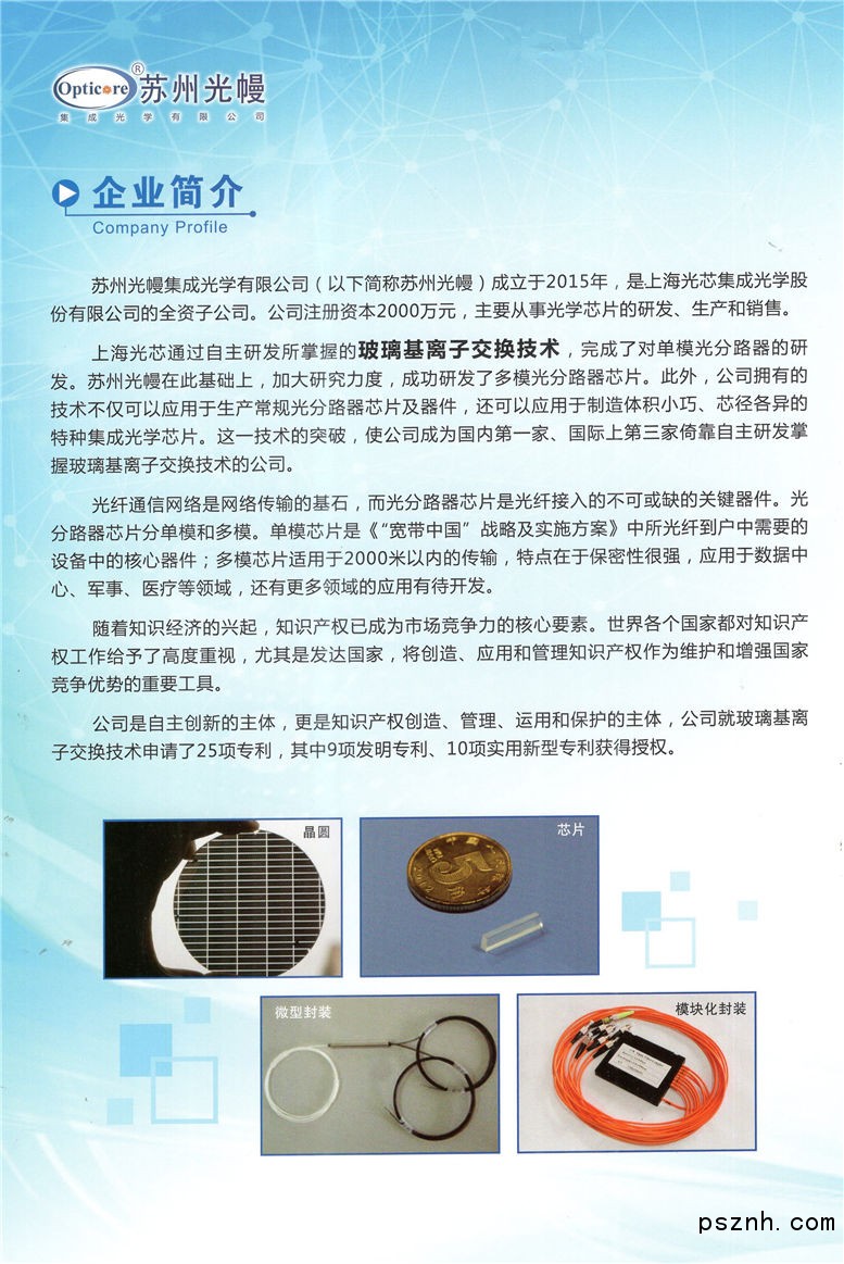 蘇州光幔集成光學有限公司注冊資本2000萬元,上海光芯通過自主研發(fā)所掌握的玻璃基離子交換技術(shù)不僅具有低成本、高性能的優(yōu)勢,而且該技術(shù)可以制造不同芯徑的光分路器芯片且體積小。蘇州光幔在此基礎(chǔ)上,加大研究力度,有了很大的突破,這一技術(shù)的突破使公司成為國內(nèi)第一家、國際上第三家依靠自主研發(fā)掌握玻璃基離子交換技術(shù)的公司。