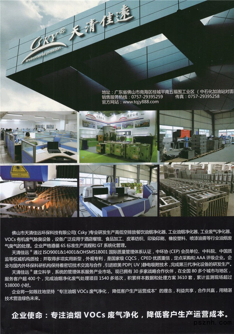 天清佳遠通過ISO9001&14001&OHSMS 18001國際質(zhì)量管理體系認證,中環(huán)協(xié)(CEP)會員單位,中科院,中國質(zhì)監(jiān)等權威機構質(zhì)檢;并取得多項實用新型、外觀專利,是國家級CQCS,CPED優(yōu)質(zhì)重信,定點采購和AAA評級企業(yè)。企業(yè)與國內(nèi)外環(huán)??蒲袡C構保持著密切技術交流與合作,引進歐美PDP(UV)靜電吸附技術,完成第三代凈化設備的研發(fā)生產(chǎn)。