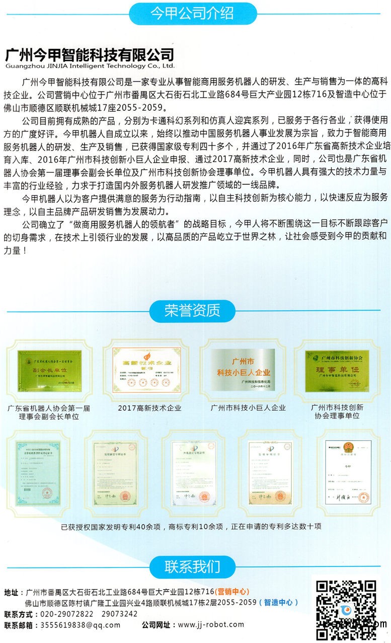 廣州今甲智能科技有限公司是一家專業(yè)從事智能商用服務(wù)機器人的研發(fā)、生產(chǎn)與銷售為一體的高科技企業(yè)。公司營銷中心位于廣州市番禺區(qū)大石街石北工業(yè)路684號巨大產(chǎn)業(yè)園12棟716室及智造中心位于佛山市順德區(qū)順聯(lián)機械城17座2055-2059室。公司目前擁有成熟的產(chǎn)品,分別為卡通科幻系列和仿真人迎賓系列,已服務(wù)于各行各業(yè),獲得使用方的廣度好評。今甲機器人自成立以來,始終以推動中國服務(wù)機器人事業(yè)發(fā)展為宗旨,致力于智能商用服務(wù)機器人的研發(fā)、生產(chǎn)及銷售,已獲得國家級專利四十多個,并通過了2016年廣東省高新技術(shù)企業(yè)培育入庫、2016年廣州市科技創(chuàng)新小巨人企業(yè)申報、通過2017高新技術(shù)企業(yè),同時,公司也是廣東省機器人協(xié)會第一屆理事會副會長單位及廣州市科技創(chuàng)新協(xié)會理事單位。今甲機器人具有強大的技術(shù)力量與豐富的行業(yè)經(jīng)驗,力求于打造國內(nèi)外服務(wù)機器人研發(fā)推廣領(lǐng)域的一線品牌。