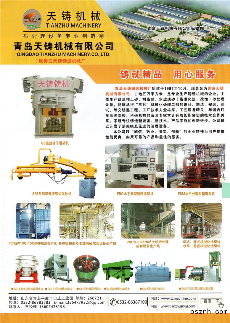 青島天鑄機械有限公司(原青島天鑄鑄造機械廠),始建于一九九七年,占地面積50000平方米,是集科研、設計、制造、安裝調(diào)試于一體的鑄造機械專業(yè)生產(chǎn)廠家;原機械工業(yè)部鑄造機械定點生產(chǎn)企業(yè);已通過ISO9001質(zhì)量體系認證。本廠在鑄造砂處理設備的研制開發(fā)中,先后開辟了國內(nèi)S14系列混砂設備、冷凝樹脂砂再生設備的新領域。本廠與國內(nèi)許多高等院校、科研機構(gòu)的資深專家學者有著長期密切的技術合作關系,先后研制成功了20多個類別、200多種新產(chǎn)品。