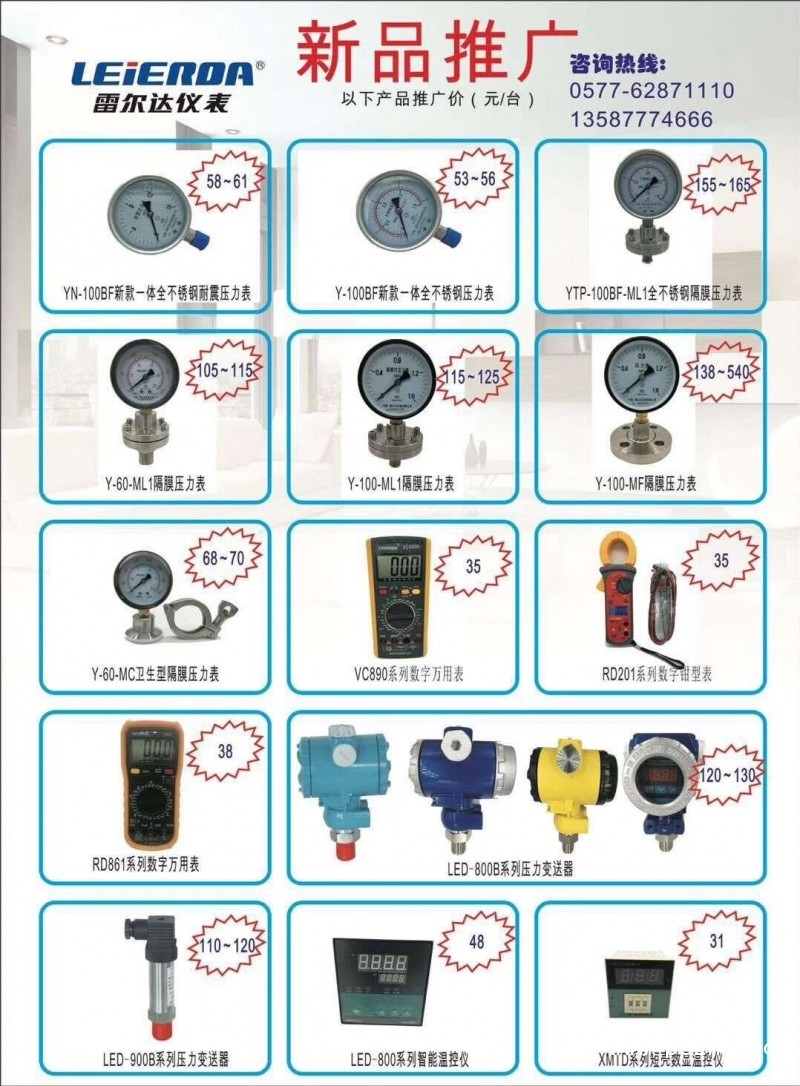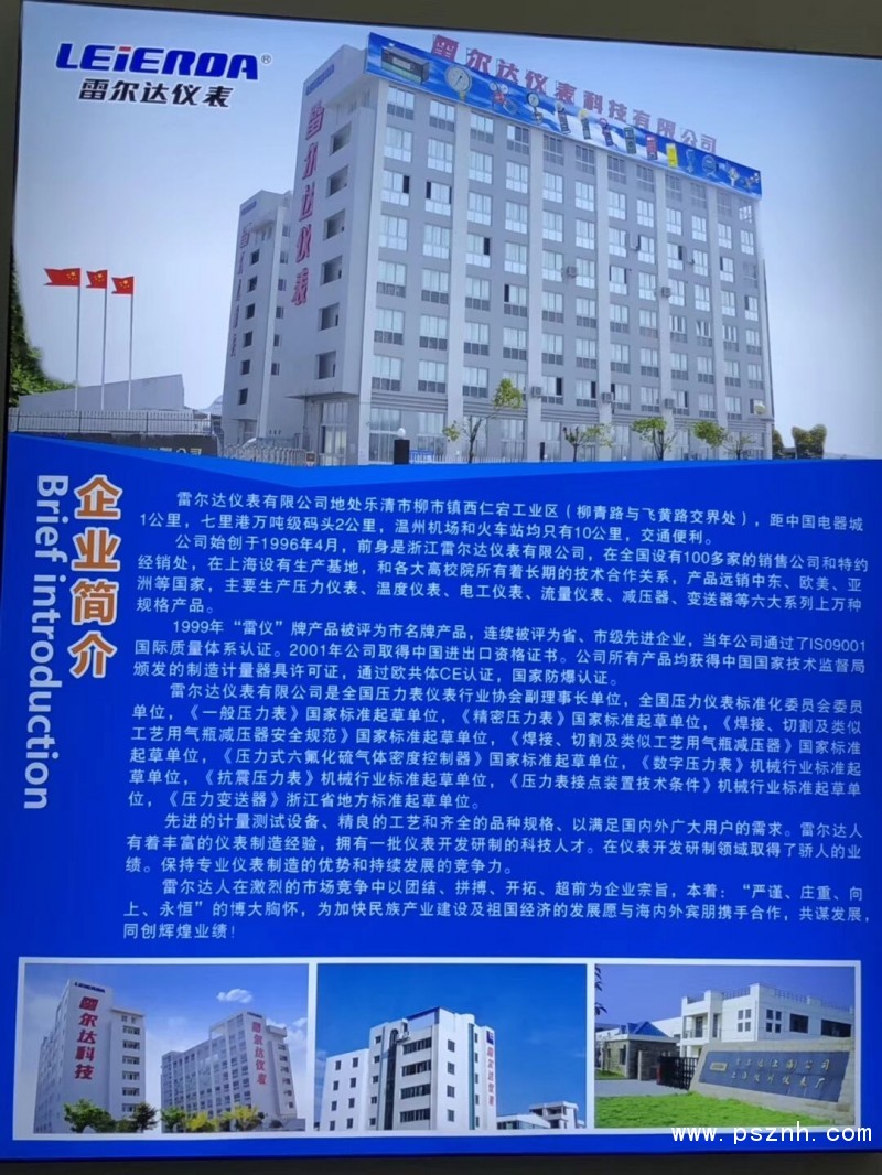 公司始創(chuàng)于1996年4月,前身是浙江雷爾達(dá)儀表有限公司,目前公司在樂清、上海、杭州均設(shè)有生產(chǎn)基地,全國設(shè)有 80多家的銷售公司和特約經(jīng)銷處,產(chǎn)品遠(yuǎn)銷中東、歐美等國家,主要生產(chǎn)壓力儀表、溫度儀表、電工儀表、流量儀 表、減壓器、變送器等六大系列6000多種規(guī)格產(chǎn)品