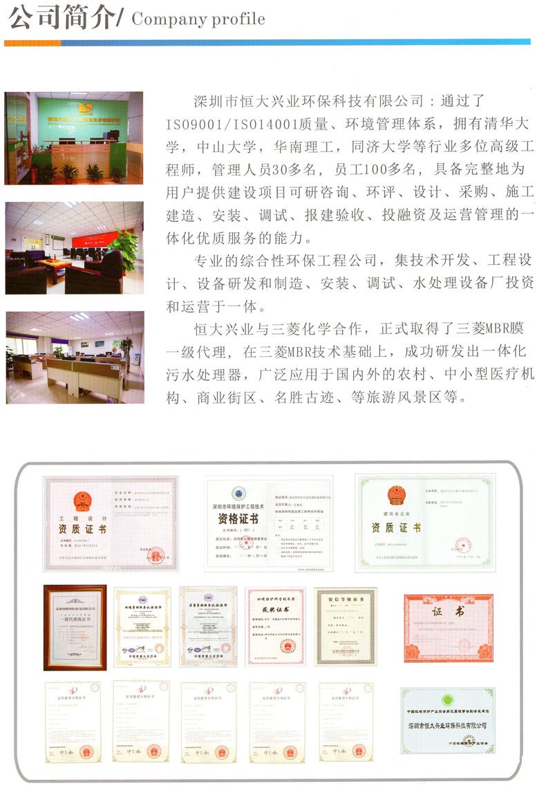 作為21世紀推廣環(huán)保水處理新理念“全膜法”的先行者,恒大興業(yè)公司實行ISO9001/ISO14001質量、環(huán)境管理體系,擁有清華大學,中山大學,華南理工,大連理工等行業(yè)多位高級工程師,管理人員20多名,員工100多名,具備完整地為用戶提供建設項目可研咨詢、環(huán)評、設計、采購、施工建造、安裝、調試、報建驗收、投融資及運營管理的一體化優(yōu)質服務的能力。