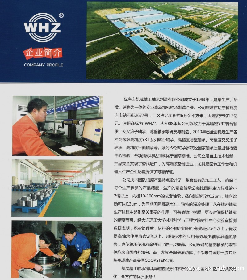 瓦房店凱威精工軸承制造有限公司成立于1993年,是集生產(chǎn),研發(fā),銷售為一體的大型專業(yè)軸承制造企業(yè)。公司座落在遼寧省瓦房店市鉆石街2677號,廠區(qū)占地面積約6萬多平方米,建筑面積約34800平方米(其中辦公樓面積6000多平方米,生產(chǎn)車間25800多平方米),固定資產(chǎn)1億2千萬元,先進(jìn)的機(jī)械設(shè)備426臺,精良的儀器儀表300余臺套,有職工536余人,其中高級工程師43人,注冊商標(biāo)為"WHZ",主要生產(chǎn)"0-9"類精度等級可達(dá)P2級的各種標(biāo)準(zhǔn)、非標(biāo)準(zhǔn)滾動軸承,P2級軸承多次經(jīng)國家軸承質(zhì)量監(jiān)督檢驗中心檢驗,各項指標(biāo)均達(dá)到或優(yōu)于國際標(biāo)準(zhǔn)。主產(chǎn)品為:YRT 轉(zhuǎn)臺軸承、進(jìn)口精密機(jī)床軸承國產(chǎn)替代化產(chǎn)品。精度等級為P2、UP、P4、SP和P5,內(nèi)徑從80-3000mm,并能夠自主設(shè)計生產(chǎn)標(biāo)準(zhǔn),精度等級完全達(dá)標(biāo)的軸承產(chǎn)品。已先后多年成功的為北京精雕科技有限公司、武漢武重機(jī)床有限公司、沈陽第一機(jī)床廠、安陽機(jī)床廠、齊重數(shù)控裝備股份有限公司、上海重型機(jī)床廠、青海華鼎重型機(jī)床有限責(zé)任公司、等單位實現(xiàn)了進(jìn)口產(chǎn)品替代化。同時公司積極開拓歐美等國外市場,公司產(chǎn)品已經(jīng)遠(yuǎn)銷到德國、美國、烏克蘭、韓國、臺灣等國家和地區(qū)。