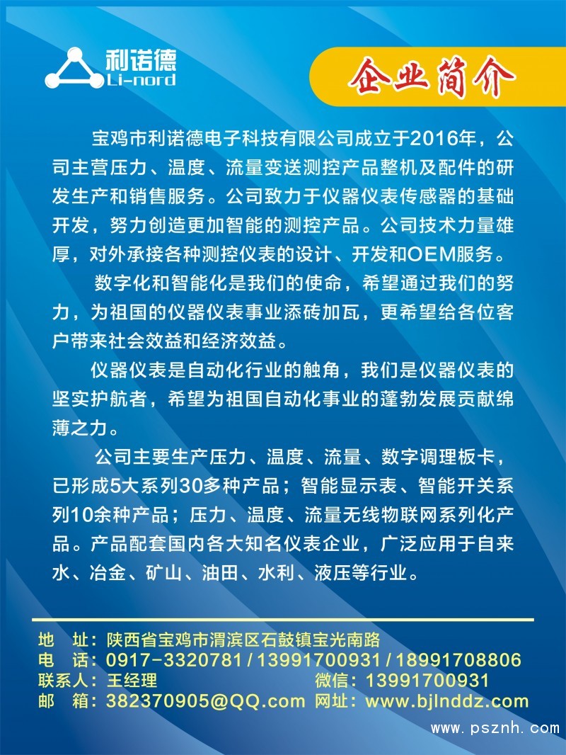 壓力變送器_液位變送器_溫度變送器_儀器儀表_壓力控制器_油田專用產(chǎn)品_信號(hào)調(diào)理板卡_物位開(kāi)關(guān)_熱式流量開(kāi)關(guān)_壓力開(kāi)關(guān)-寶雞市利諾德電子科技有限公司點(diǎn)擊:14050 評(píng)論:0 查看原圖 |