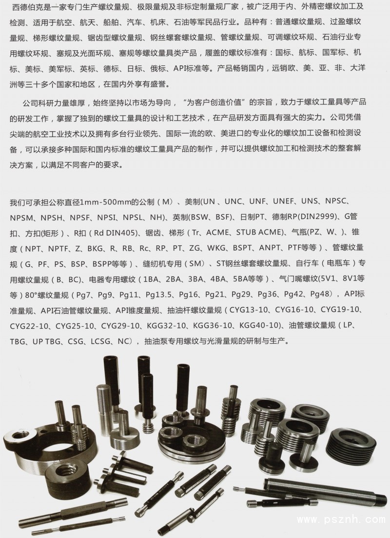 我公司可承接各種公稱直徑“1mm-1000mm”的公制、美制、英制、日制、德制、米制、管制、方扣、R扣、鋸齒、梯形、氣瓶、錐度(NPT、NPTF、Z、R、RC、RP、RB、PT、ZG)、抽油桿、油管(LP、TBG、UPTBG、CSG)、鉆桿、抽油泵專用等螺紋與光滑量規(guī)的研制與生產(chǎn)任務(wù),也可承接各種可調(diào)式量規(guī)與各種汽車用位置度規(guī)、非標刃具等。