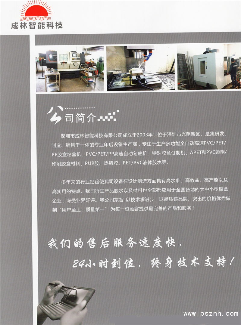 深圳市成林智能科技有限公司成立于2003年,本公司專業(yè)生產(chǎn)多功能自動膠盒粘盒機  、自動膠盒勾(扣)底機,多年來,服務(wù)于全國各地的大中小型膠盒企業(yè),深受業(yè)界一致好評。我公司使命:為客戶創(chuàng)造價值,公司愿景:做一流專業(yè)和服務(wù)的膠盒包裝機械廠家;公司價值觀:愛心、創(chuàng)新、奉獻(xiàn)。