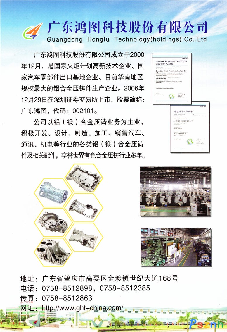 廣東鴻圖科技股份有限公司 (簡(jiǎn)稱“廣東鴻圖”)位于風(fēng)景秀麗的肇慶市。公司成立于2000年12月,是由高要鴻圖工業(yè)有限公司、廣東省科技創(chuàng)業(yè)投資公司、廣東省科技風(fēng)險(xiǎn)投資有限公司、高要市國(guó)有資產(chǎn)經(jīng)營(yíng)有限公司、廣東省機(jī)械研究所等股東共同發(fā)起設(shè)立的一家國(guó)有控股企業(yè),是國(guó)內(nèi)壓鑄行業(yè)的龍頭企業(yè),華南地區(qū)規(guī)模最大的精密鋁合金壓鑄件專業(yè)生產(chǎn)企業(yè),廣東省高新技術(shù)企業(yè),擁有廣東省唯一的省級(jí)精密壓鑄工程技術(shù)研究開(kāi)發(fā)中心。公司具備國(guó)家汽車零部件出口基地企業(yè)資格,并已通過(guò)ISO14001、ISO9000、ISO/TS16949等國(guó)際質(zhì)量體系認(rèn)證。2006年12月29日,公司股票在深圳證券交易所正式掛牌上市。