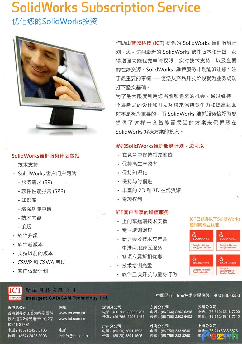 ICT自1996年開始成為SolidWorks 公司的認證分銷商,為中國廣東省、江蘇省、上海、香港及澳門地區(qū)客戶提供三維設計系統(tǒng)、三維設計解決方案及技術支持。ICT亦是中國區(qū)首家同時獲得SolidWorks支援及培訓、分析、高級服務及文檔服務認證的分銷商。2003年開始,ICT還自行開發(fā)并推出 3DQuickMold – 在SolidWorks 平臺上運行的塑膠模具設計解決方案。