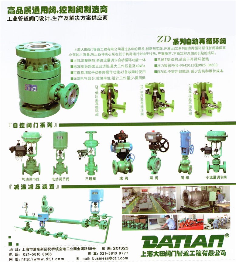 公司現(xiàn)在生產(chǎn)的產(chǎn)品有調(diào)節(jié)閥及附件、通用閥門(mén)、減溫減壓裝置、自動(dòng)再循環(huán)控制閥、電磁閥、API6A閥門(mén)等。調(diào)節(jié)閥及附件包含有:氣動(dòng)調(diào)節(jié)閥、 電動(dòng)調(diào)節(jié)閥、自力式調(diào)節(jié)閥、手動(dòng)調(diào)節(jié)閥、氣動(dòng)薄膜執(zhí)行機(jī)構(gòu)、電動(dòng)執(zhí)行機(jī)構(gòu)、電氣閥門(mén)定位器、電動(dòng)閥門(mén)調(diào)節(jié)模塊等。通用閥門(mén)包含有:閘閥、截止閥、球閥、蝶閥、止回閥、水力控制閥、柱塞閥、旋塞閥、隔膜閥、安全閥、減壓閥、疏水閥、排氣閥、平衡閥、針型閥及多種襯里閥門(mén)等。減溫減壓裝置分為低壓、中壓、次高壓、高壓四種規(guī)格。自動(dòng)再循環(huán)控制閥分為低壓、中壓、高壓三種規(guī)格。電磁閥包含有:水用電磁閥、蒸汽電磁閥、煤氣電磁閥、空氣電磁閥、真空電磁閥、高溫電磁閥等。API6A閥門(mén)包含有閘閥、節(jié)流閥等。同時(shí),公司可按照客戶的要求進(jìn)行非標(biāo)產(chǎn)品的設(shè)計(jì)、制造、加工。