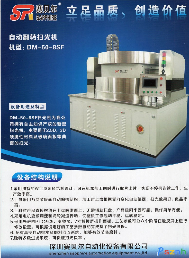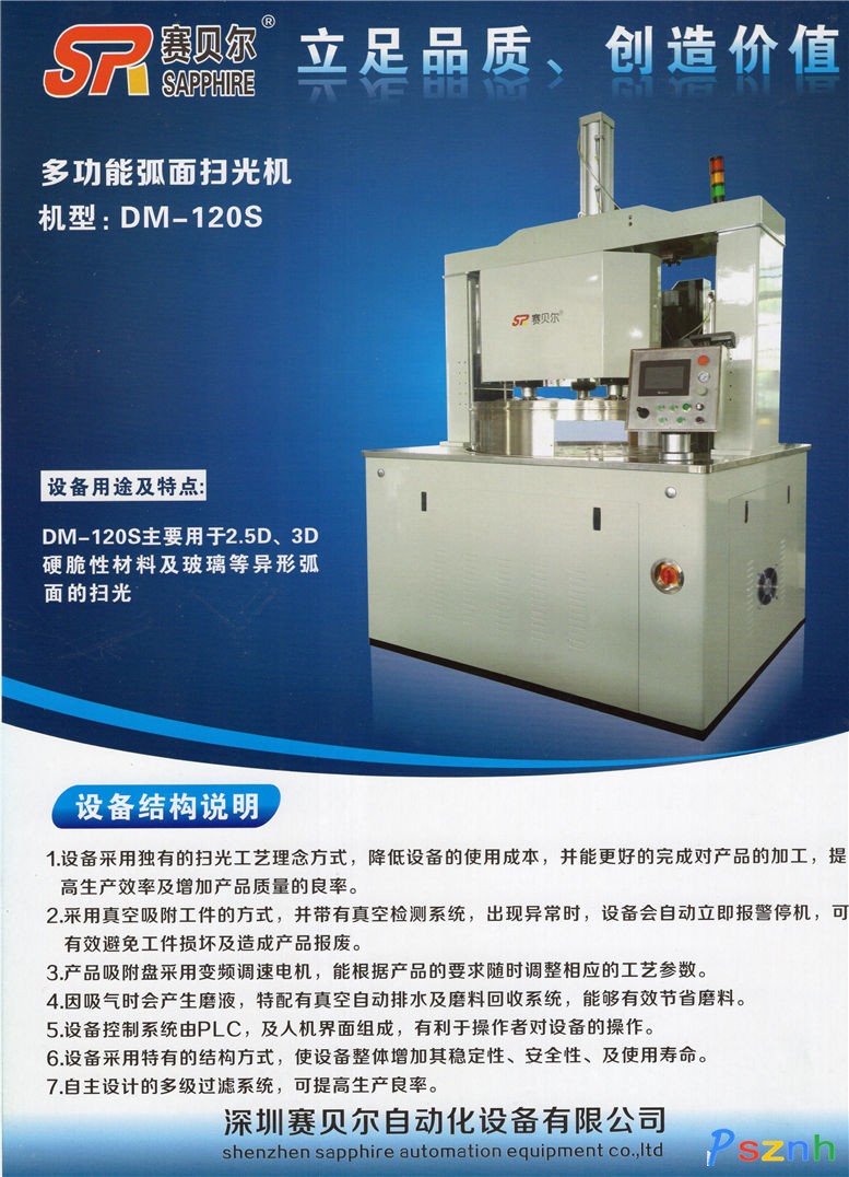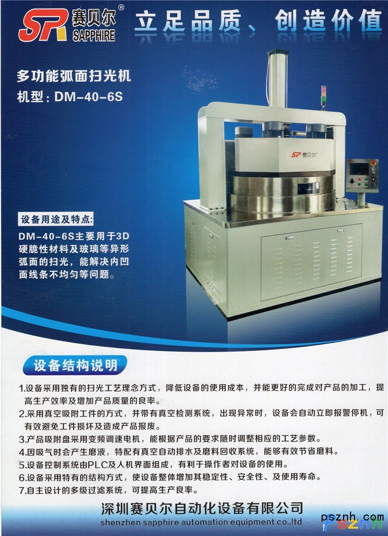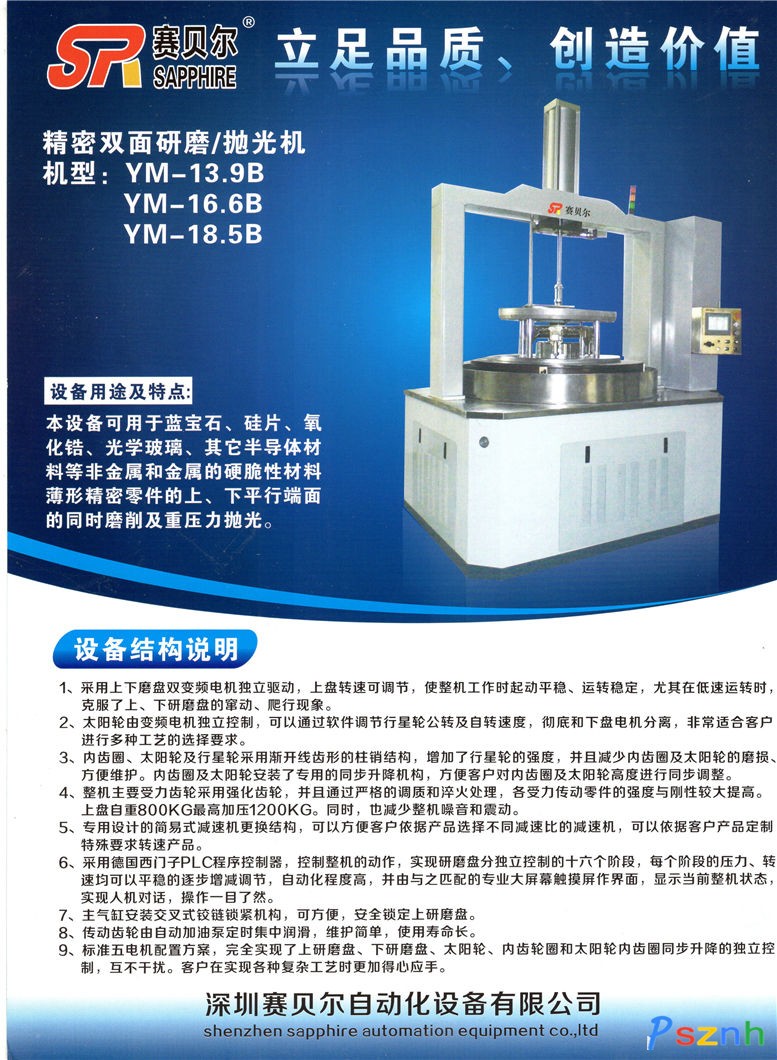 公司主導產品有:針對藍寶石、氧化鋯、金屬、玻璃等精密、超硬材料研磨及拋光的雙面研磨機、雙面拋光機 、單面拋光機;針對弧面鏡片及光邊的光邊機、弧面拋光機、雙弧面精研拋光機;針對藍寶石、氧化鋯超薄片的磨拋加工(0.08mm~1.0mm);針對異形產品加工專門設計開發(fā)的各類加工專用設備。公司對藍寶石、氧化鋯、金屬等材料有成熟工藝,購買設備培訓工藝,歡迎來樣試加工。