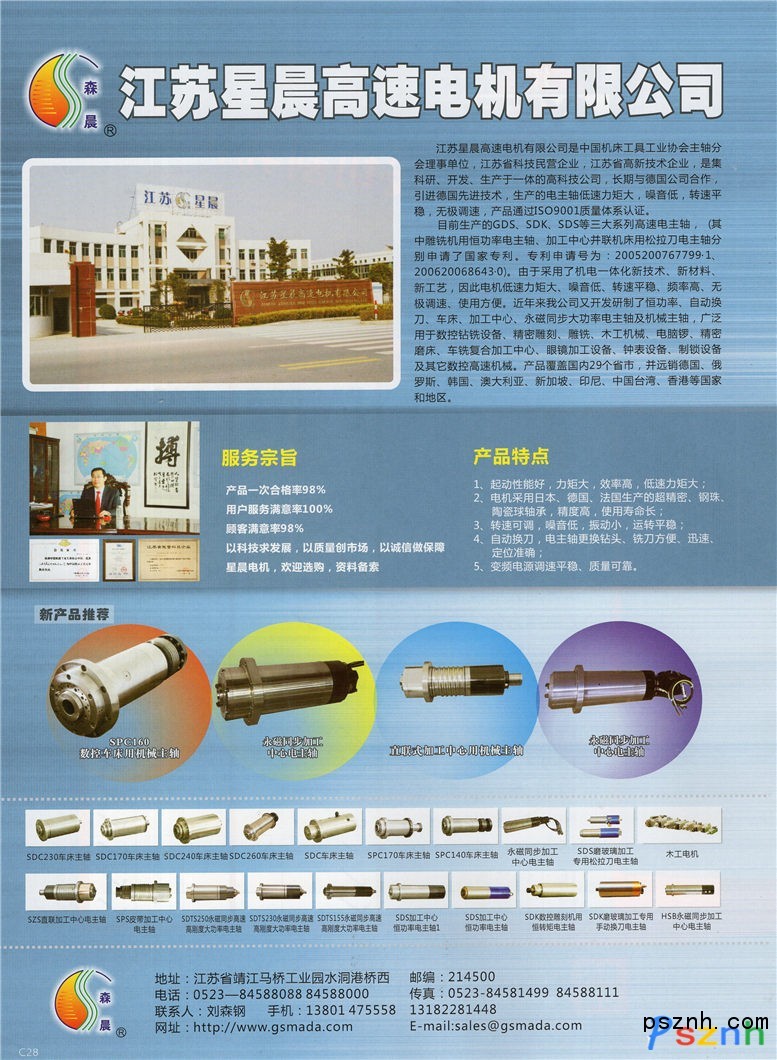 江蘇星晨高速電機有限公司是中國機床工具工業(yè)協(xié)會主軸分會理事單位,江蘇省科技民營企業(yè),江蘇省高新技術(shù)企業(yè),江蘇省百家優(yōu)秀科技成長型企業(yè),國內(nèi)電主軸行業(yè)標(biāo)準(zhǔn)起草單位之一,是集研發(fā)、設(shè)計、生產(chǎn)于一體的高科技公司。