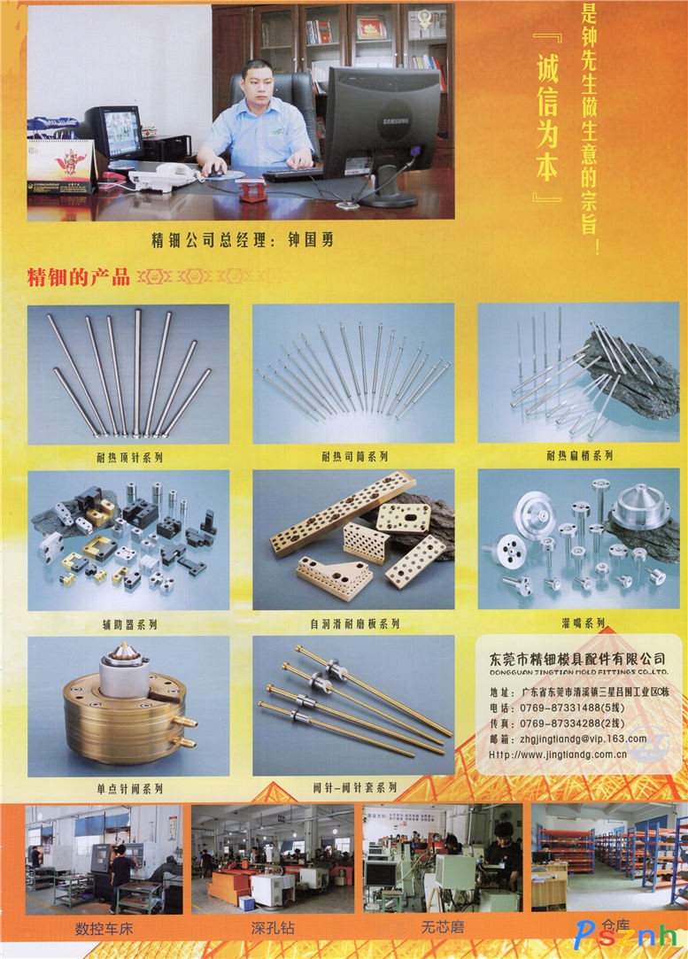 東莞市精鈿模具配件有限公司始創(chuàng)于1998年,正式成立于2002年,主要致力于塑膠模具、壓鑄模具、五金模具及熱流道零件的研發(fā)、生產(chǎn)銷售、技術(shù)支持及售后服務(wù)。東莞市精鈿模具配件有限公司不斷為塑膠模具、壓鑄模具、五金模具熱流道零件的標(biāo)準化、產(chǎn)業(yè)化及產(chǎn)品的通用性、互換性而不懈努力。   隨著中國出口模具的蓬勃發(fā)展,為匹配出口模具的高品質(zhì)、交期快的需求,自2003年開始,東莞市精鈿模具配件有限公司全力專注于歐洲美國亞洲品牌標(biāo)準塑膠模具配件的中國制造與技術(shù)支持。并能依循國標(biāo)GB 、日標(biāo)JIS、德標(biāo)DIN、美標(biāo)AISI等國際行業(yè)標(biāo)準制作。   在產(chǎn)品多元化的同時,東莞市精鈿模具配件有限公司在生產(chǎn)加工能力、品質(zhì)控制過程、技術(shù)解決水平、以及整體服務(wù)解決方案方面都有了很大的進步與發(fā)展,贏得了客戶的認可與信賴。   隨著公司的日益壯大,2009年,公司榮獲了IS09001:2008質(zhì)量標(biāo)準認證并開始拓展海外市場。   我們倡導(dǎo)以高效的、年輕向上的團隊