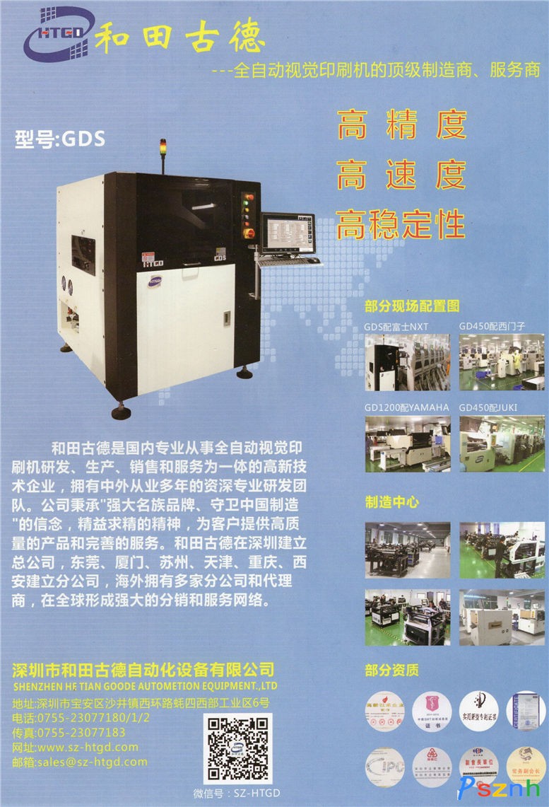 深圳市和田古德自動(dòng)化設(shè)備有限公司于2008年開(kāi)始研發(fā)全自動(dòng)錫膏印刷機(jī),于2011年正式登記注冊(cè)成立和田古德公司,是國(guó)內(nèi)專業(yè)從事全自動(dòng)錫膏視覺(jué)印刷機(jī)研發(fā),生產(chǎn),銷售和服務(wù)為一體的高新技術(shù)企業(yè)。公司于2012年推出了"鋼網(wǎng)糾偏"系列印刷機(jī),填補(bǔ)了國(guó)內(nèi)在這一領(lǐng)域的技術(shù)空白。結(jié)合之前推出的GD系列印刷機(jī),現(xiàn)在公司擁有多款機(jī)型,分別應(yīng)用于SMT,半導(dǎo)體,LED,鋰電池,航天,軍工等高端企業(yè)。