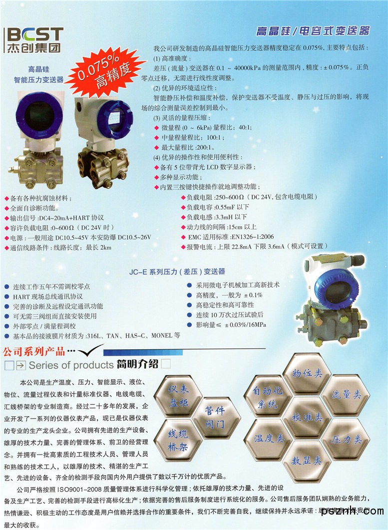 江蘇杰創(chuàng)科技有限公司(BCST簡稱杰創(chuàng)集 團)成立于2010年,坐落于有荷文化之鄉(xiāng)美譽的中國江蘇省金湖縣工業(yè)園區(qū)。是以江蘇杰創(chuàng)科技有限公司為主體和控股的四家子公司組建成立的高科技企業(yè)集團。是江蘇省儀表線纜特色重點培育基地。集團總資產(chǎn)近2億元人民幣,占地面積10萬平方米,員工總數(shù)500多名。集團公司以儀器儀表、電線電纜、電氣設(shè)備、新型能源等為主營業(yè)務(wù),憑借良好的口碑,產(chǎn)品已被石油、電力、化工、制藥、煤礦、冶金、煉油等諸多行業(yè)和企業(yè)所信賴。