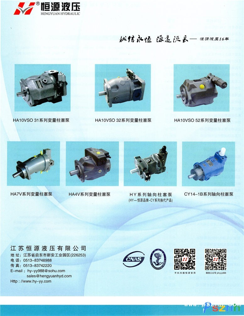 恒源液壓是專業(yè)從事高壓柱塞泵(馬達)研發(fā)、制造的專業(yè)企業(yè),創(chuàng)建于2000年。中國液壓氣動密封工業(yè)協(xié)會會員、中國工程機械協(xié)會配套件分會會員、江蘇省機械工程學會理事單位。產(chǎn)品有HA7V系列、HA10VSO(31/32/52)系列、HA4VSO系列、HY系列(HY-HENGYUAN簡稱-恒源品牌)、CY系列柱塞泵(馬達)等七大系列300多個品種,適用于鍛壓、剪折機床,金屬回收、工程、建筑、礦山機械,冶金設備及船舶、水利、環(huán)保機械等領域。主要為國內(nèi)主機、液壓成套企業(yè)提供配套及售后市場服務,并出口歐美、南美、東南亞等國家和地區(qū)。