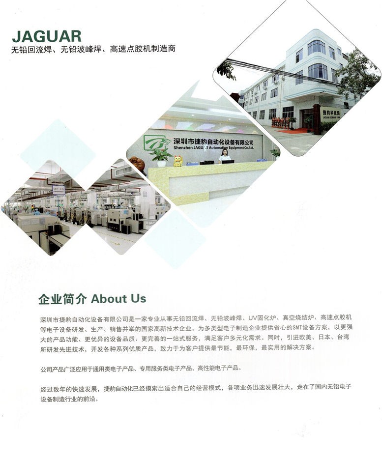 深圳市捷豹自動(dòng)化設(shè)備有限公司是一家專業(yè)從事無(wú)鉛回流焊,無(wú)鉛波峰焊等無(wú)鉛電子設(shè)備研發(fā)、生產(chǎn)、銷售并舉的高新技術(shù)企業(yè)。 公司秉承"因?qū)I(yè)而崛起,因?qū)W⒍l(fā)展"的理念,并引進(jìn)歐美、日本、臺(tái)灣所研發(fā)先進(jìn)技術(shù),開發(fā)各種系列優(yōu)質(zhì)產(chǎn)品,致力于為客戶提供最節(jié)能,最環(huán)保,最實(shí)用的解決方案。