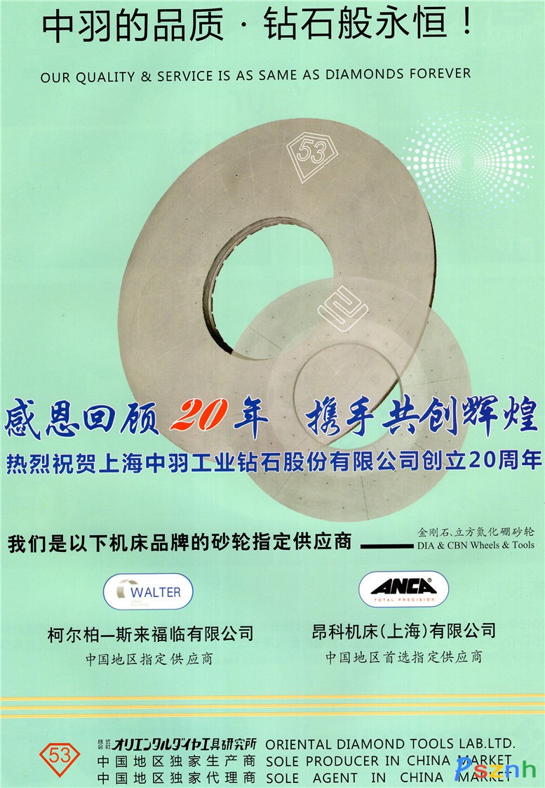 我司自1998年開始和日本株式會社オリエンタルダイヤ工具研究所(Oriental Diamond Tools Lab. Ltd.)開始正式中日合作在上海生產(chǎn)OEM金剛石(DIA)砂輪和立方氮化硼(CBN)砂輪,其產(chǎn)品分為三大類:一是專用于磨削各類硬質(zhì)合金的樹脂結(jié)合劑DIA砂輪和磨削各類鋼材的樹脂結(jié)合劑CBN砂輪;二是專用于磨削各類玻璃、磁性材料等的金屬結(jié)合劑DIA砂輪;三是專用于磨削各類PCD和PCBN刀具的陶瓷結(jié)合劑DIA砂輪以及專用于磨削各種鋼材的陶瓷結(jié)合劑CBN砂輪。所有產(chǎn)品的原材料及生產(chǎn)工藝均由日本Oriental公司提供并完全按照日本國家標(biāo)準(zhǔn)予以生產(chǎn)。